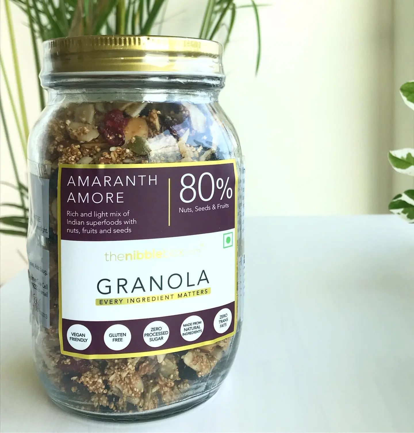 Every spoon of Amaranth Amore Granola is packed with premium nuts, seeds, fruits, and superfoods.