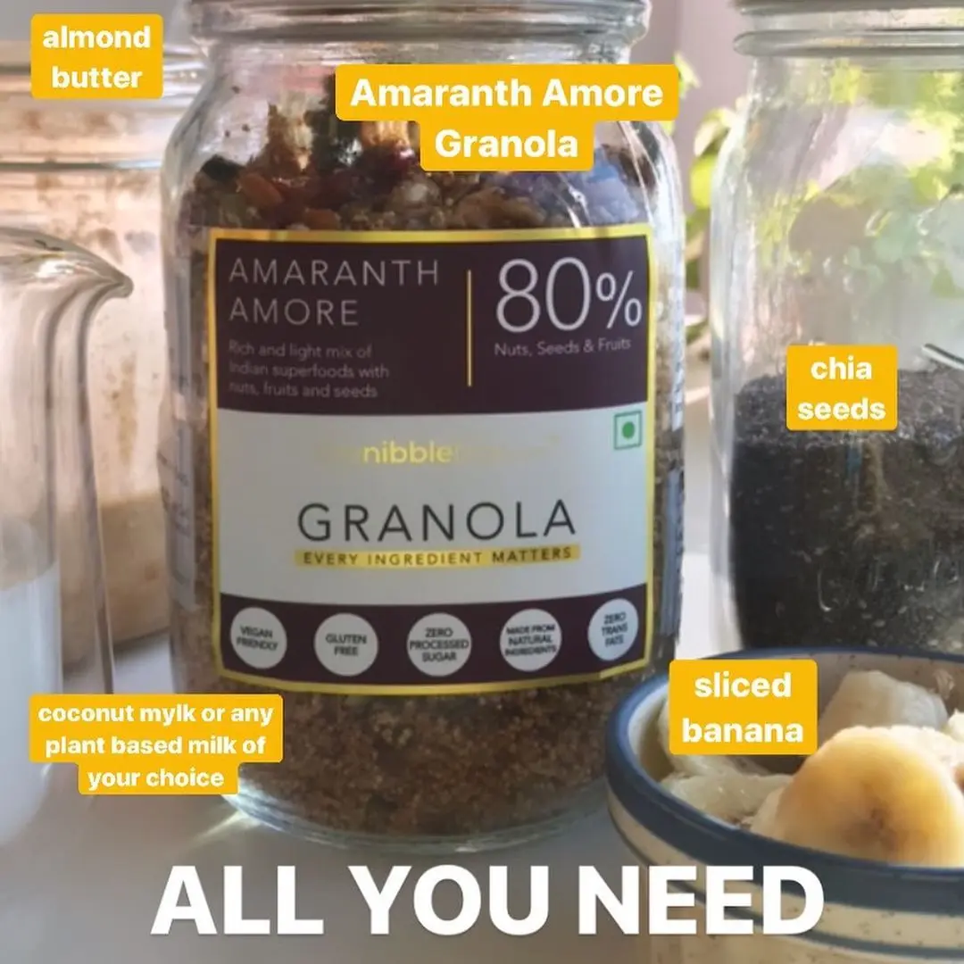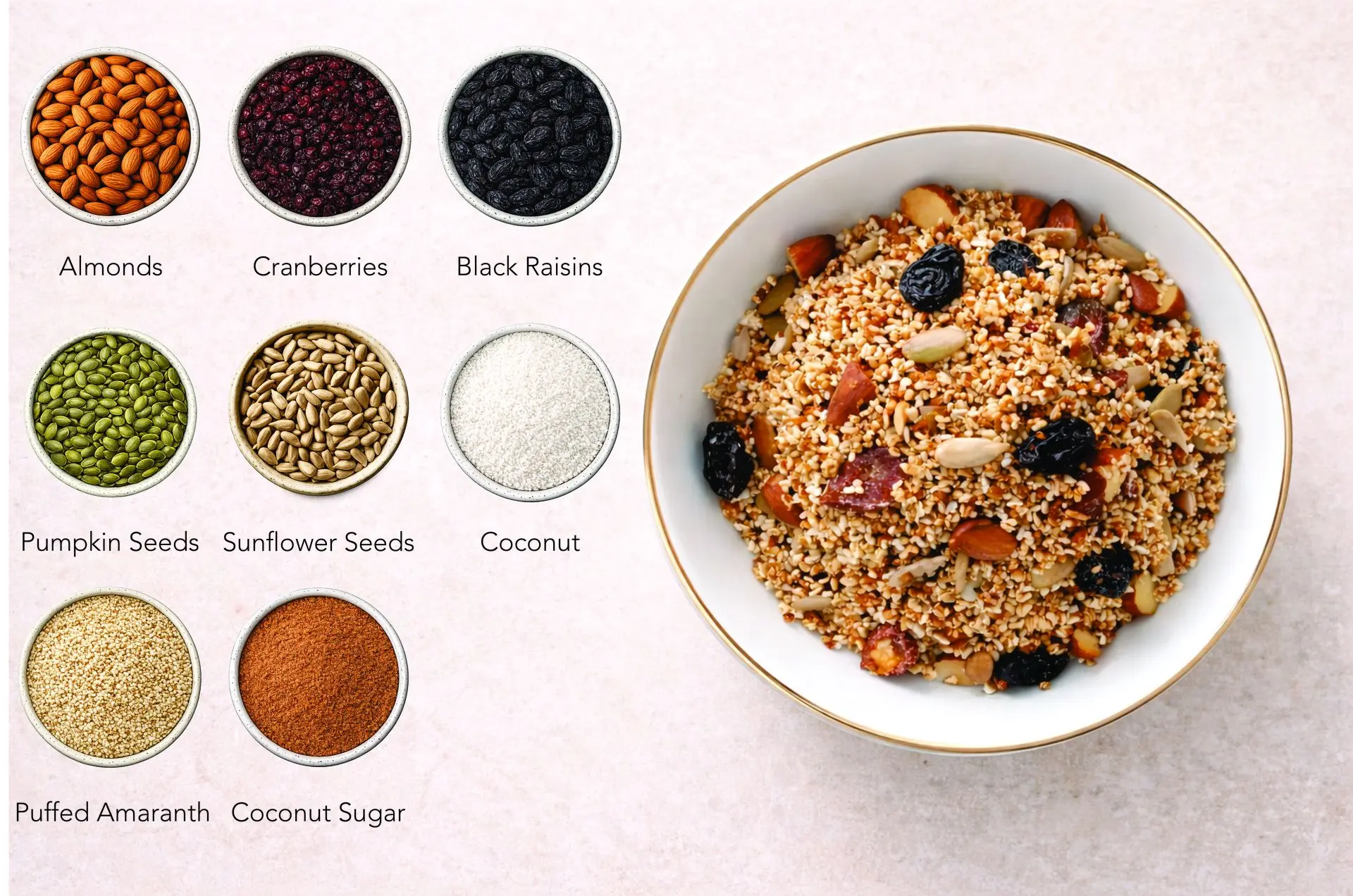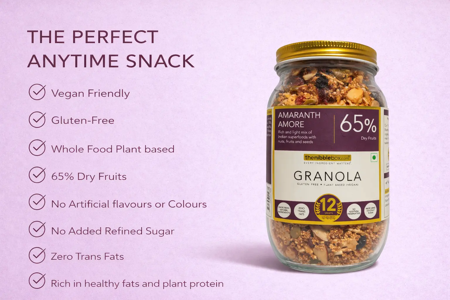 Every spoon of Amaranth Amore Granola is packed with premium nuts, seeds, fruits, and superfoods.