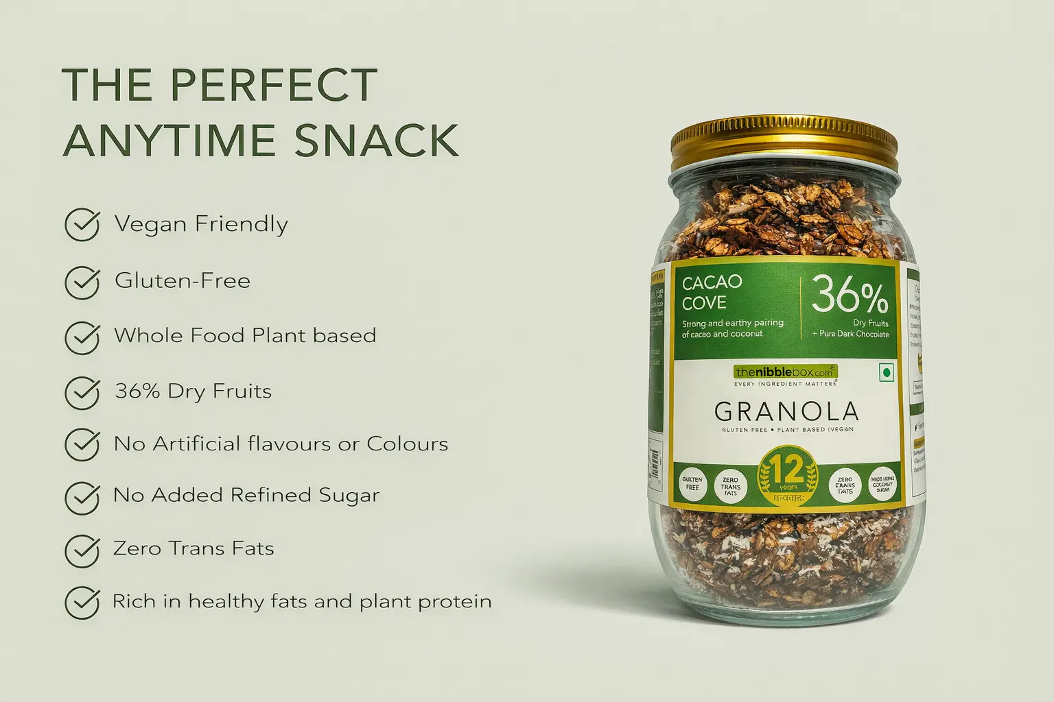 No artificial sweeteners. No sugar syrups viz. invert syrups. No molasses. No preservatives. No additives. No artificial flavours. No artificial colours. No emulsifiers. No acidity regulators. No bad oils – no palm oil, no vegetable oil. No wheat flakes, No Malt extract, No lecithin, No tocopherol/ Vitamin E, No permitted flavours, No artificial antioxidants, No added antioxidants, No sunflower oil, No vegetable fat, No corn flakes.
