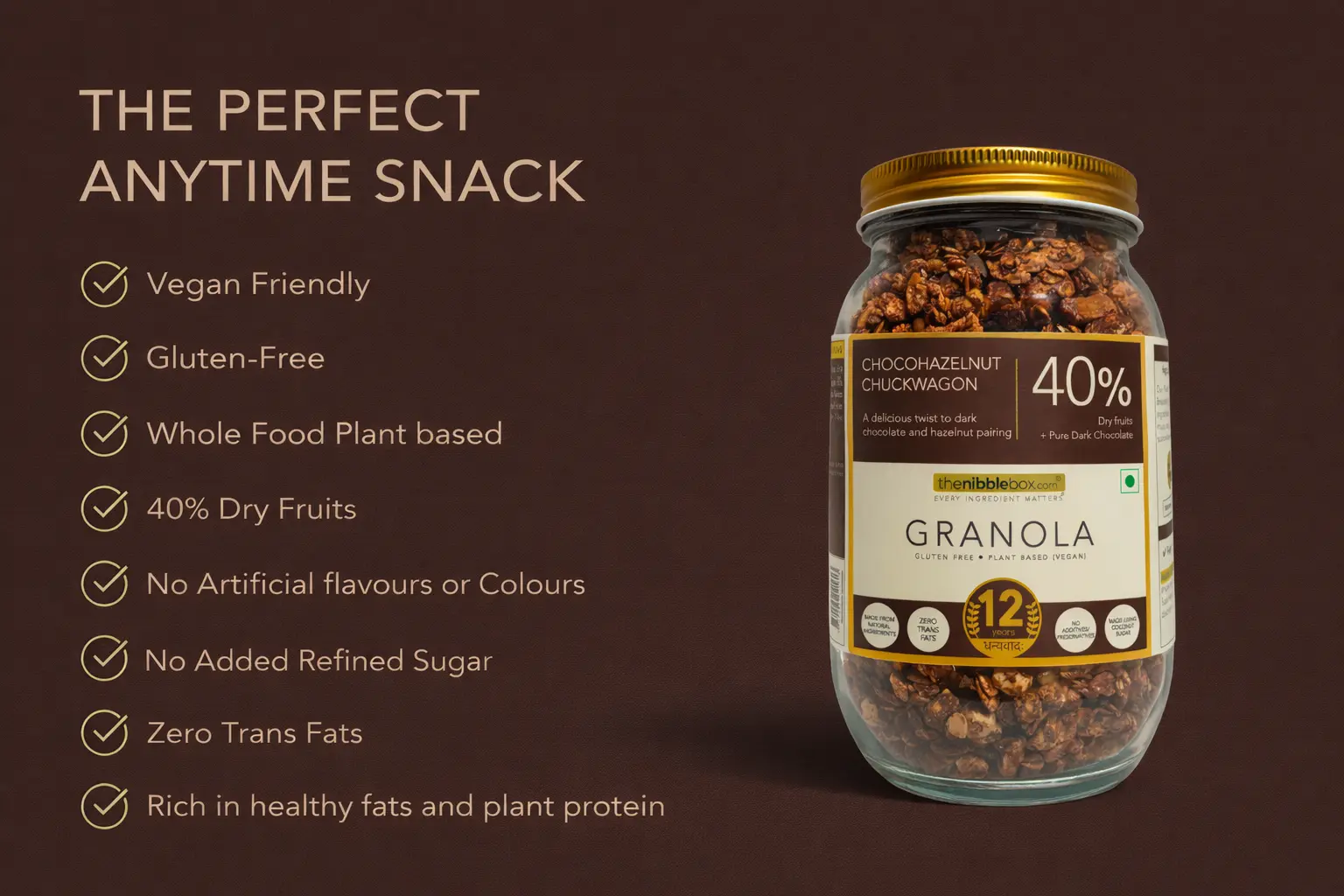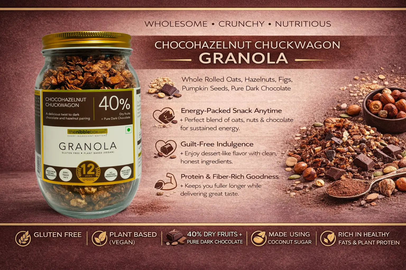Chocohazelnut Chuckwagon Granola by The Nibble Box is a rich, crunchy, and wholesome granola crafted for those who love the irresistible combination of chocolate and hazelnuts. Made with whole rolled oats, premium hazelnuts, figs, pumpkin seeds, and pure dark chocolate, this granola delivers a delicious blend of taste, nutrition, and natural energy.