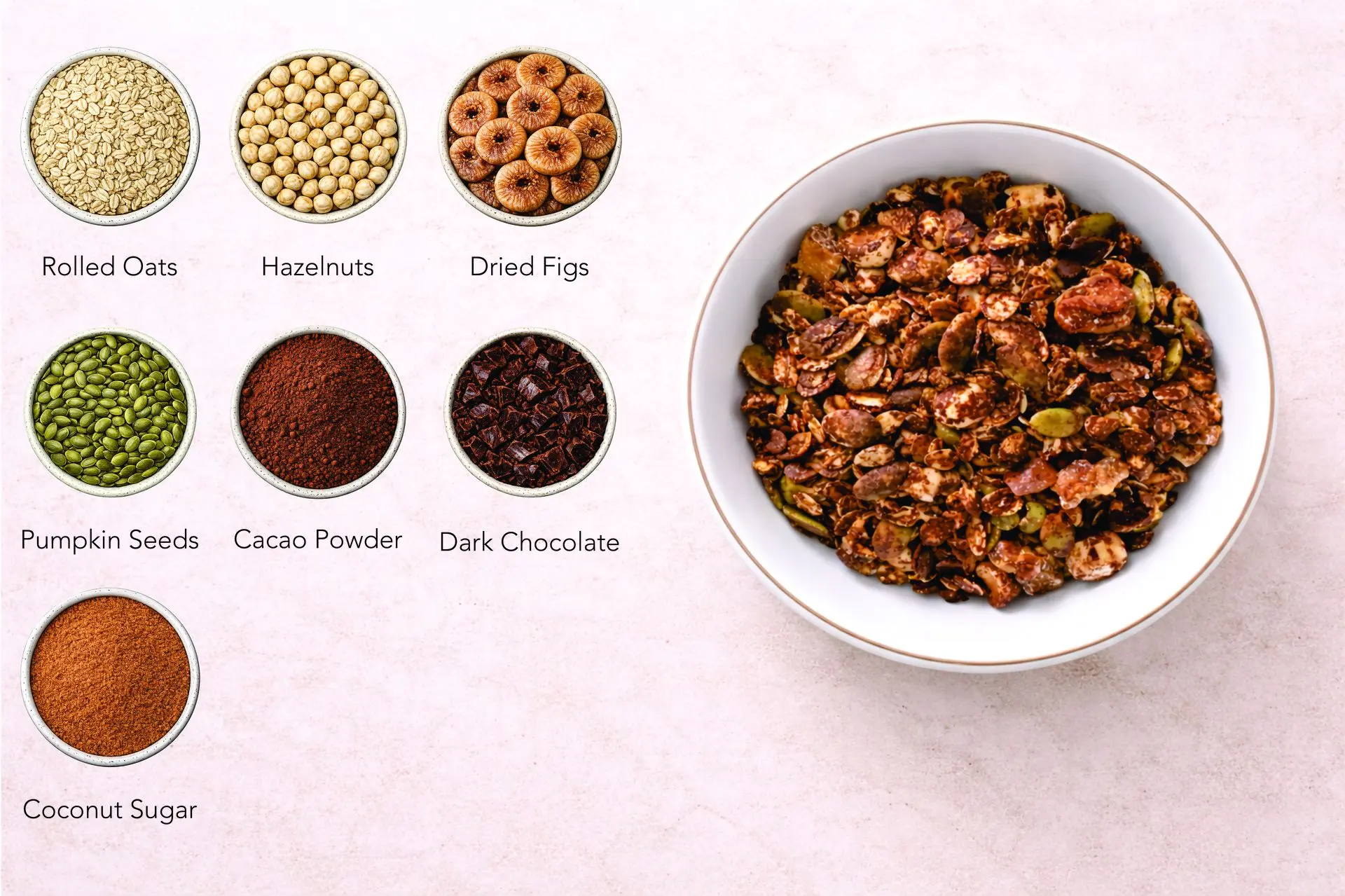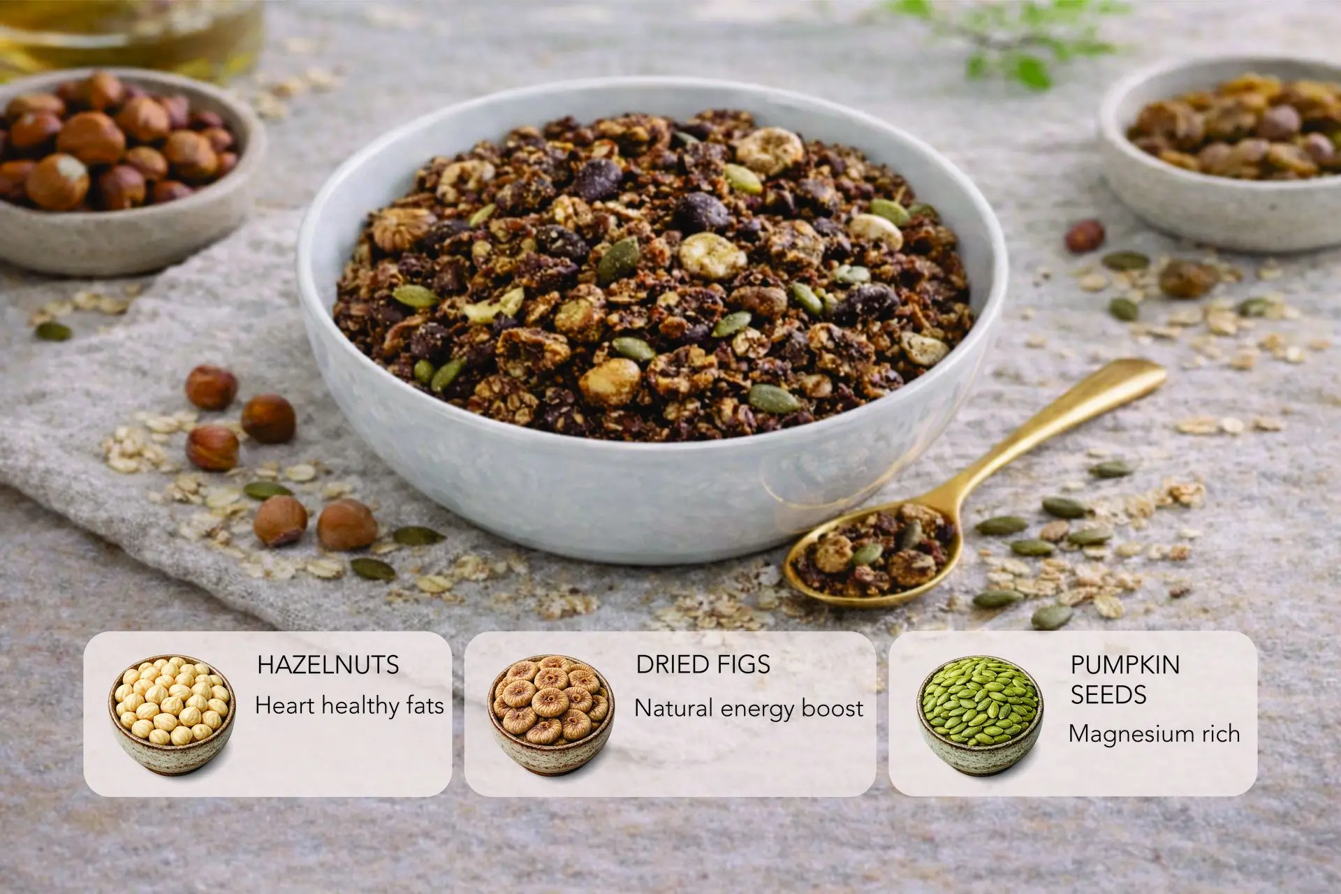 Pumpkin seeds and figs add essential minerals, fiber, and natural sweetness to the granola blend.