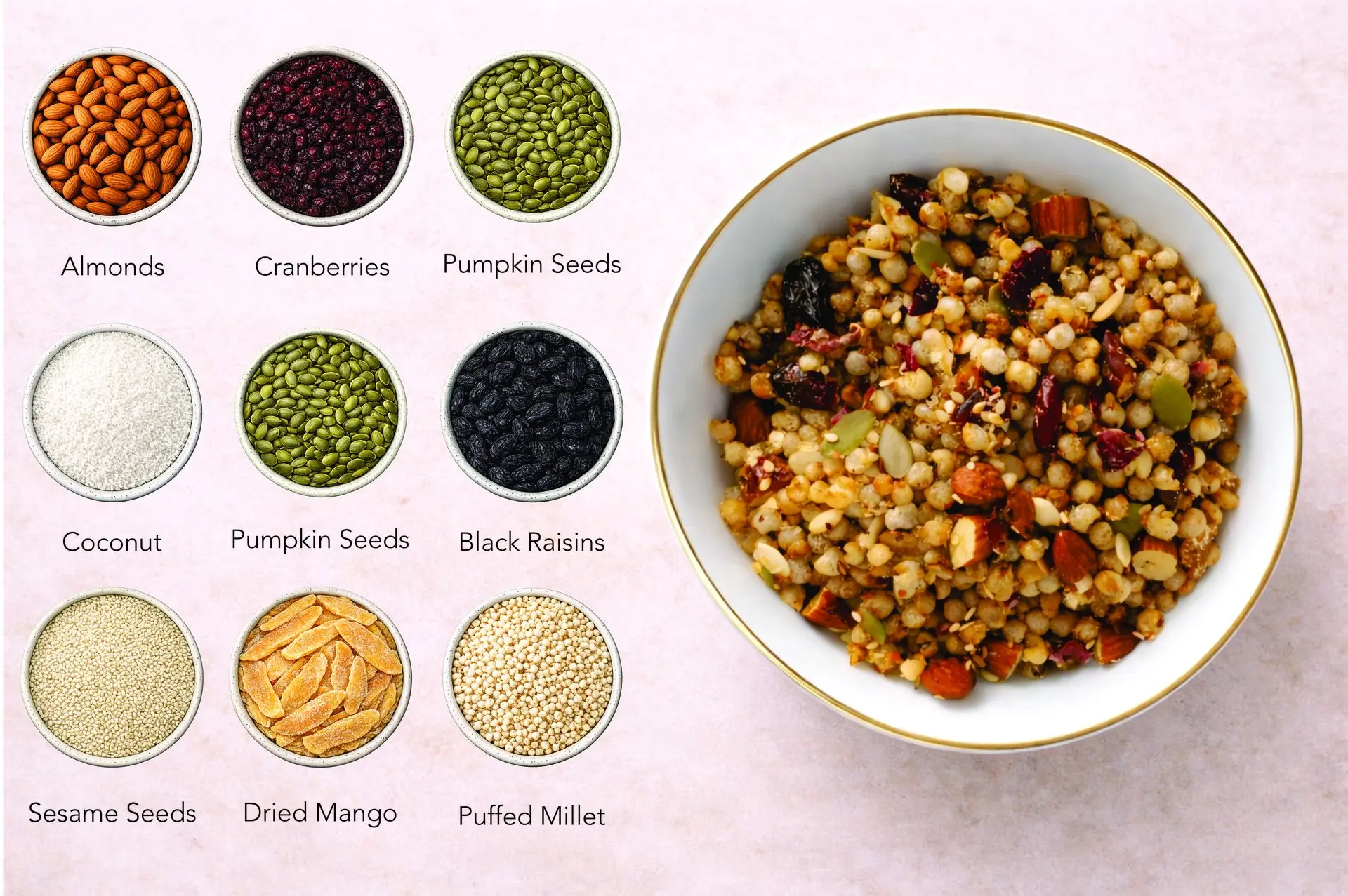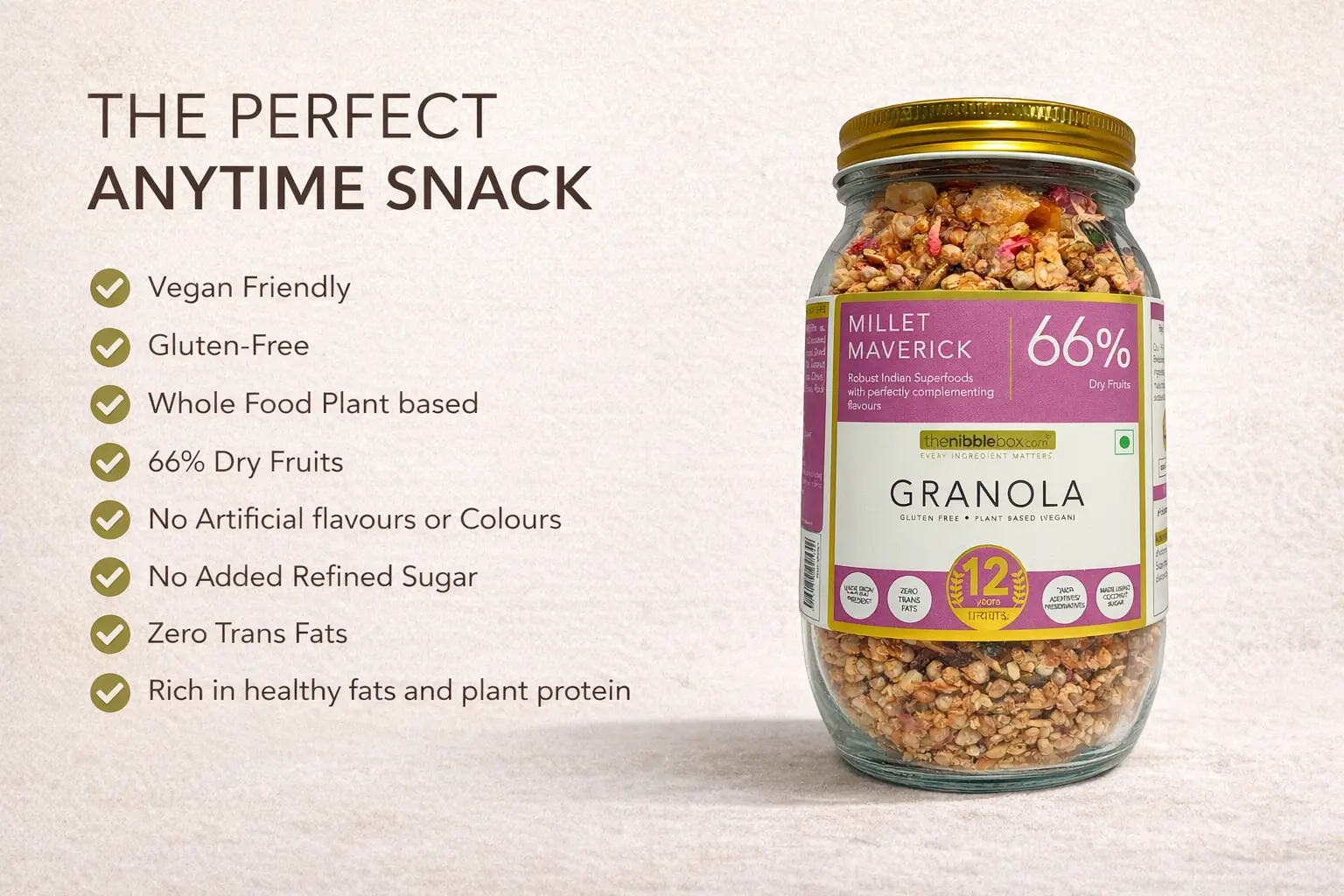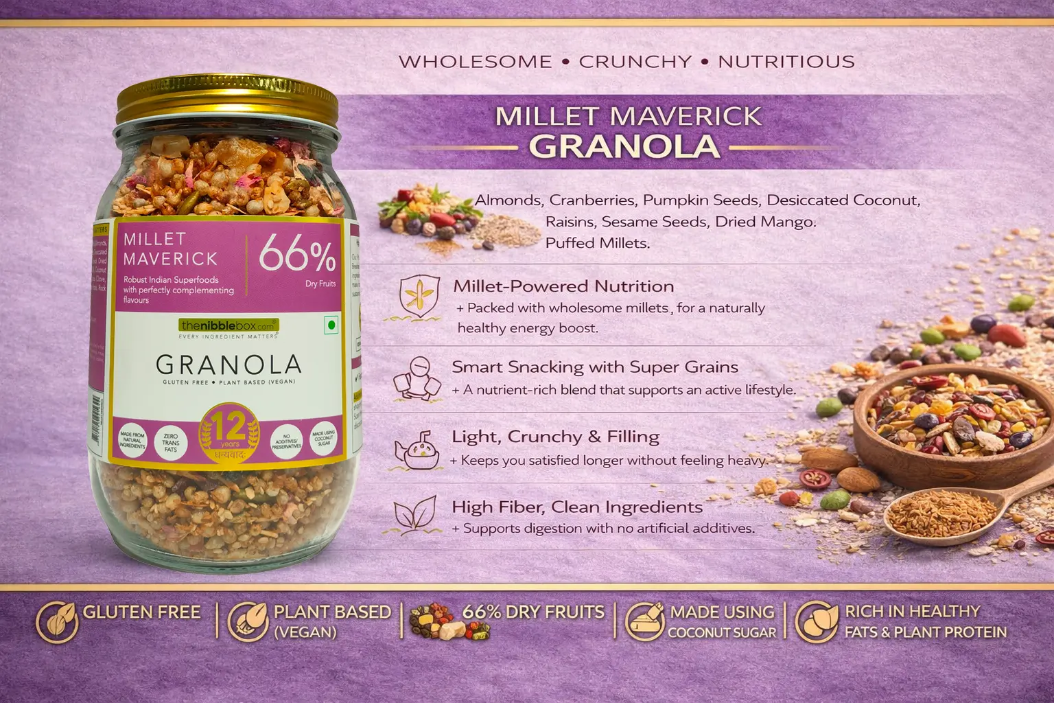 Millet Maverick Granola by The Nibble Box is a wholesome, crunchy, and nutrient-dense granola powered by the goodness of millets, nuts, seeds, and dried fruits. Crafted with puffed millets, almonds, cranberries, pumpkin seeds, sesame seeds, desiccated coconut, raisins, and dried mango, this delicious blend delivers a perfect balance of flavor, crunch, and nutrition.