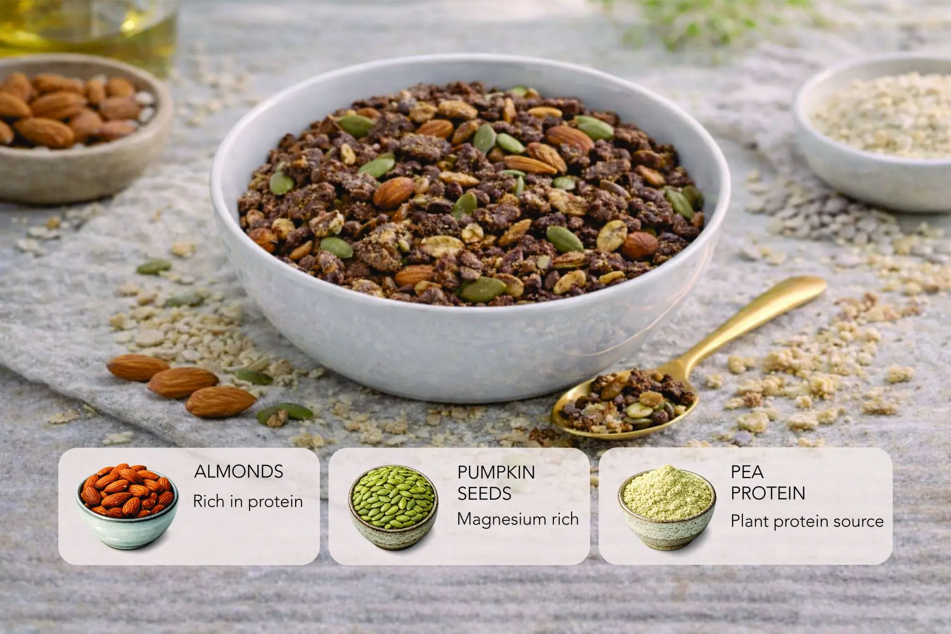 Flax seeds provide omega-3 fatty acids and fiber, while pea protein butter adds extra plant protein to support active lifestyles.