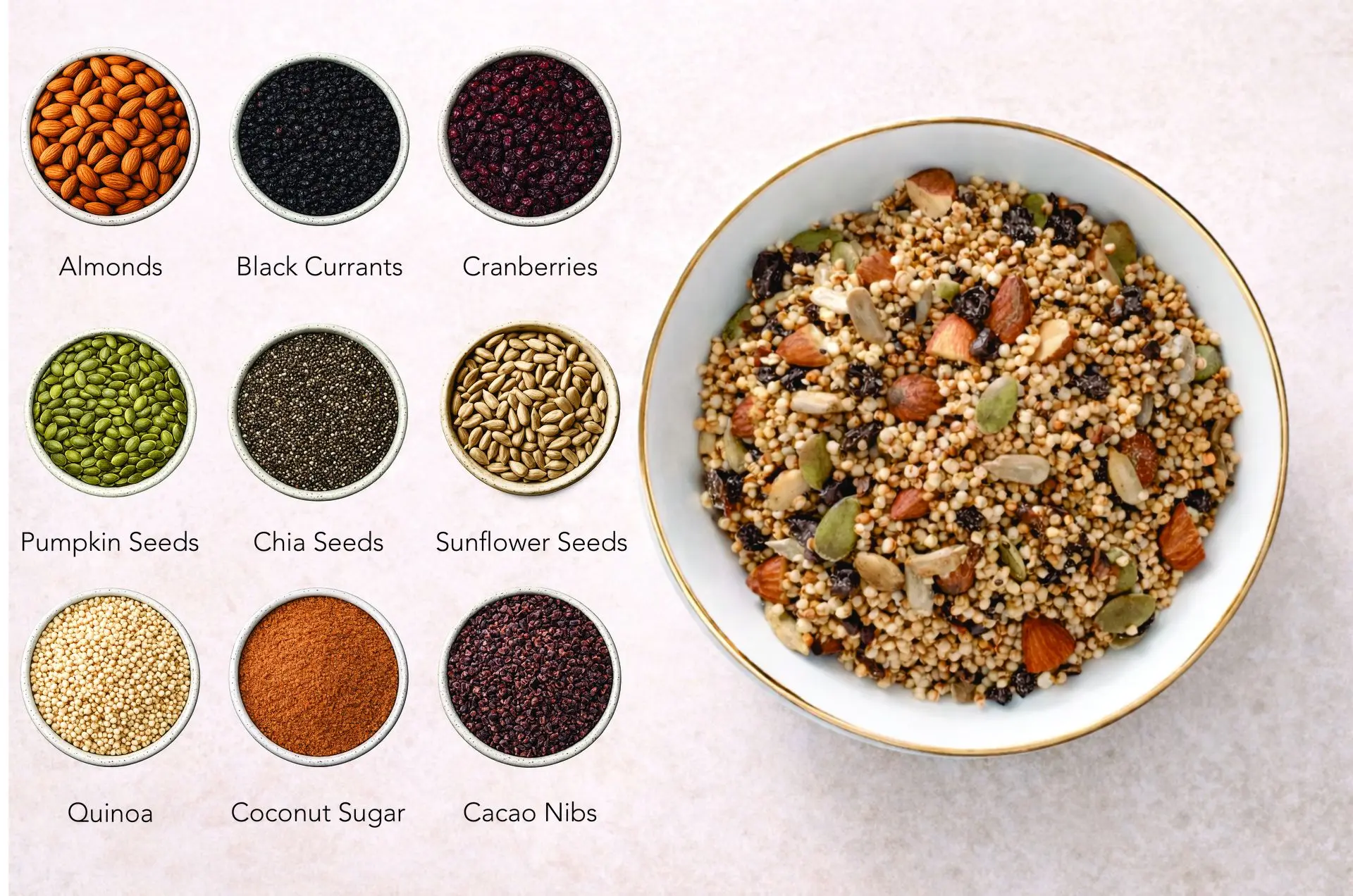 Every spoon of Quinoa Cruise Granola is packed with premium nuts, seeds, fruits, and superfoods.